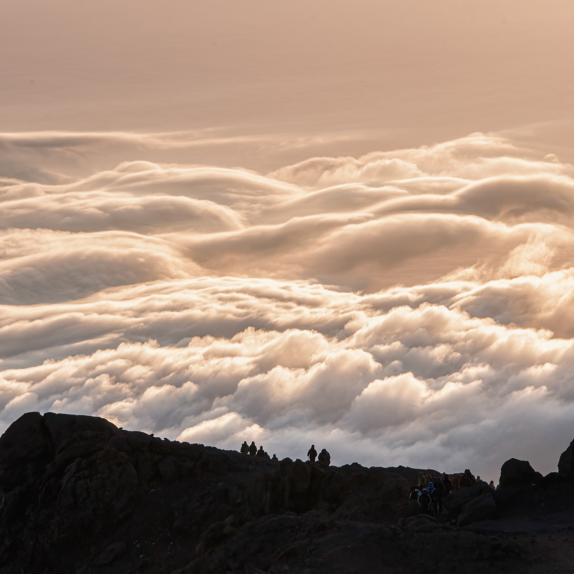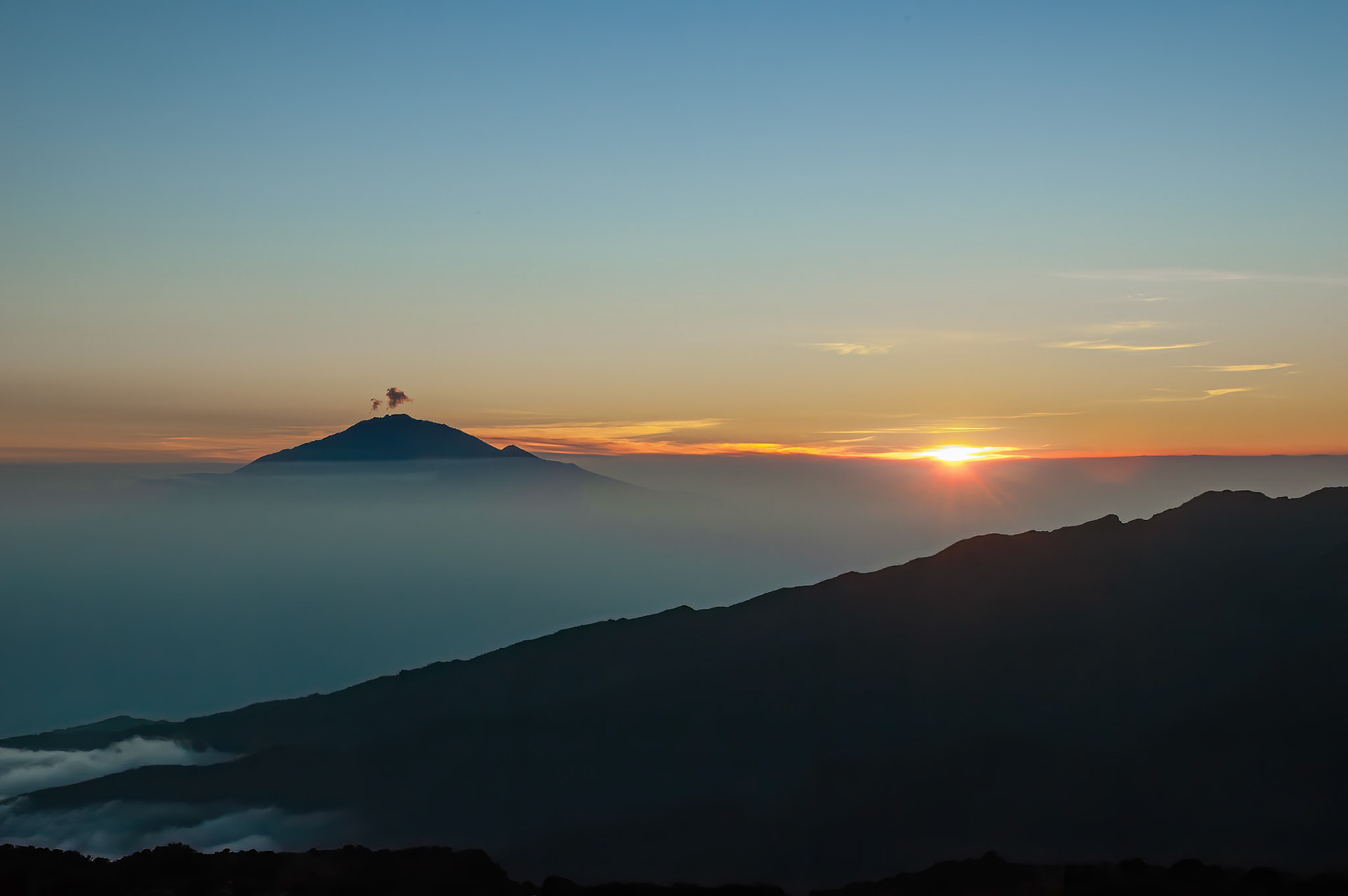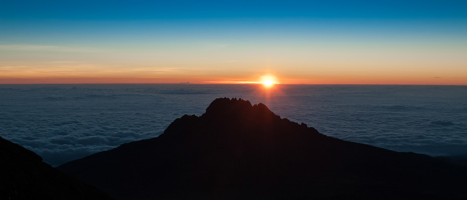The early morning sun rising over Mawenzi looking back from the summit of Kilimanjro