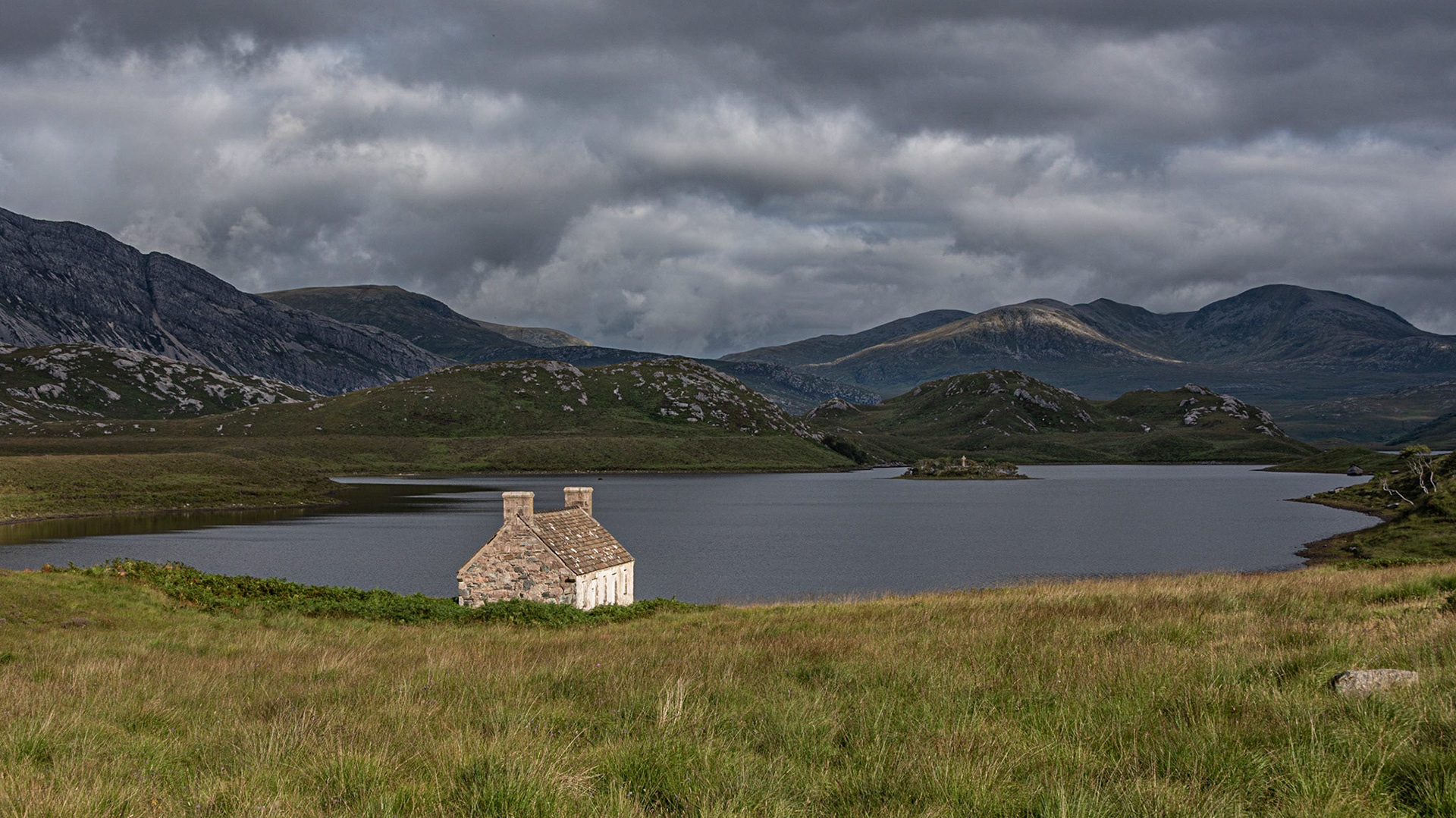 Boat house at Loch Arklet with approaching storm clouds over the Arrochar Alps, near Stronachlachar, Loch Lomond & The Trossachs National Park, Scotland