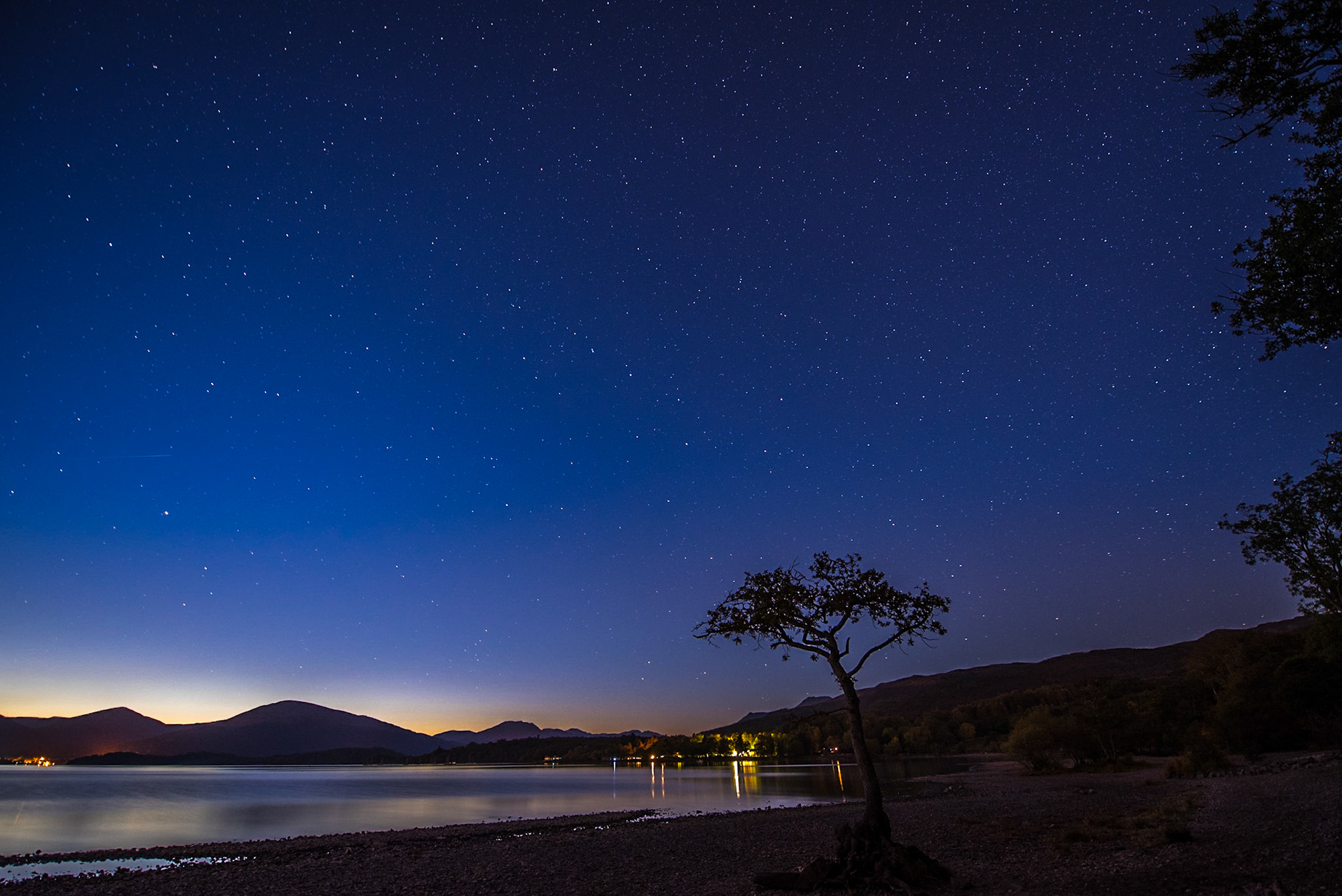Looking over Loch Lomond from the lone tree at Milarrochy Bay at sunset