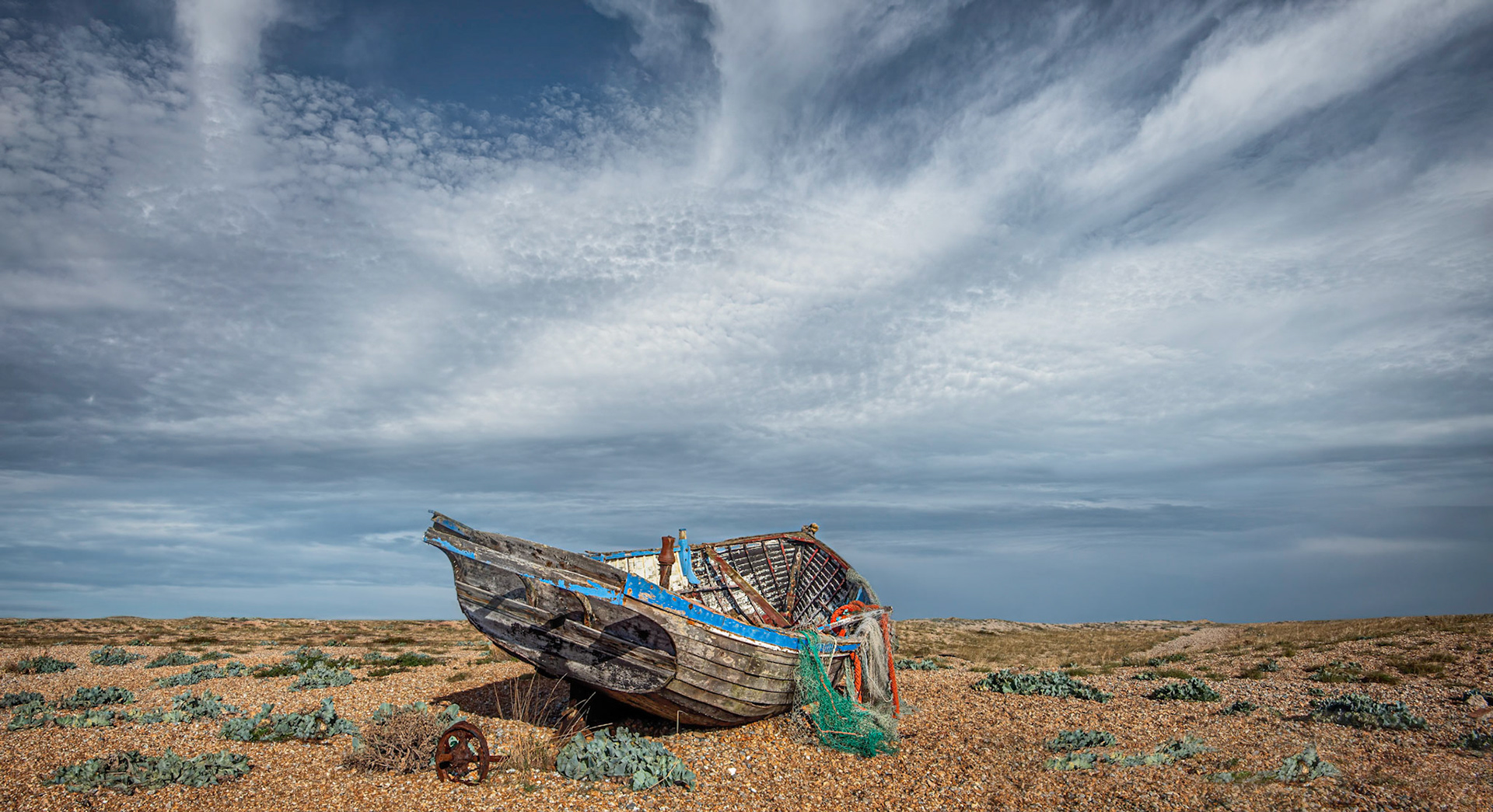 Sunset at the beach at Cleveleys on the Lancashire Coast with the artwork Mary's Shell in the foreground